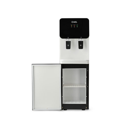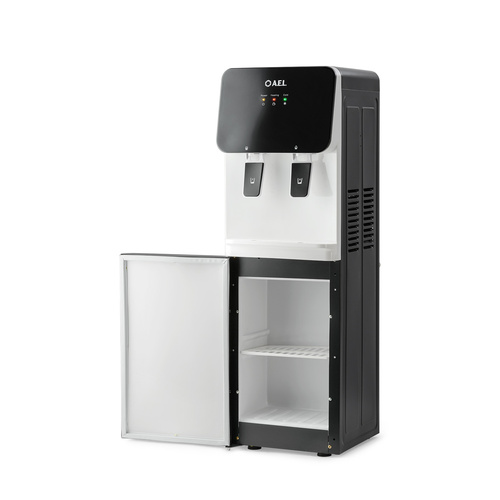 Напольный кулер с электронным охлаждением, нагревом и шкафчиком для продуктов.