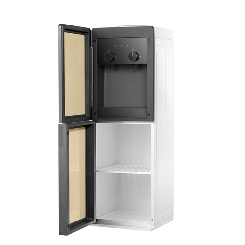С лицевой стороны все привычные рабочие элементы кулера (краники, каплесборник) скрыты за стеклянной дверцей. Это придаёт, как эстетики устройству, так и дополнительную гигиеническую защиту зоны подачи воды от попадания пыли, бактерий и т.д. Дверца шкафчика снизу также имеет стеклянное покрытие, что в целом делает облик кулера дорогим и стилистически законченным, сродни холодильникам элитных серий.
