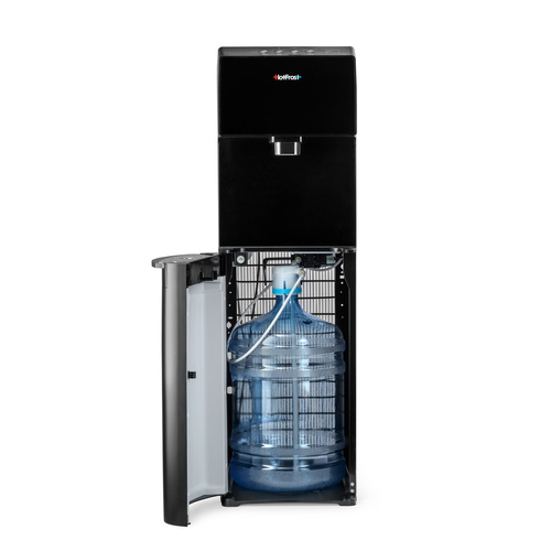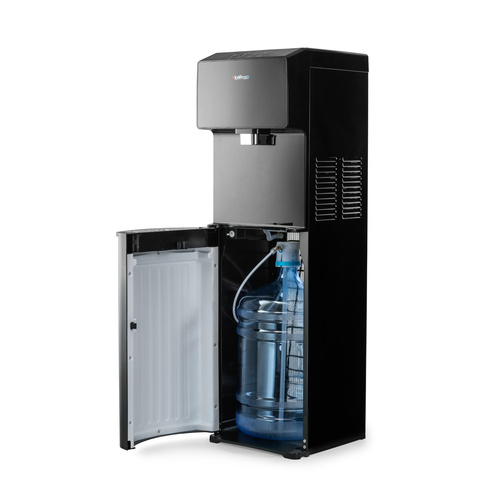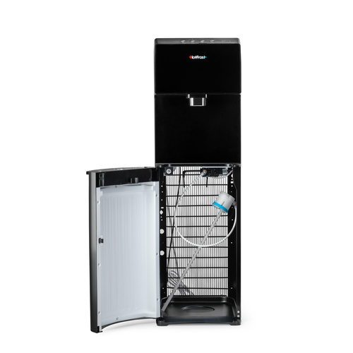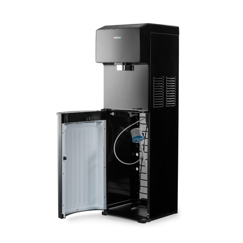 Т.к. в кулере используется нижняя загрузка бутыли (в шкафчик для бутыли), то для визуального контроля уровня воды, на панели управления имеется индикатор низкого уровня воды в бутыли, извещающий о необходимости произвести замену бутыли.