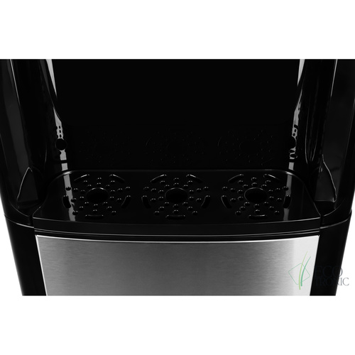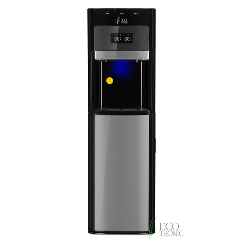 Напольный кулер с нижней загрузкой, электронным охлаждением и LED-дисплеем в верхней части в черном глянцевом корпусе со вставками из нержавеющей стали.
