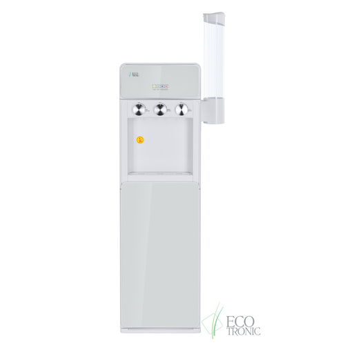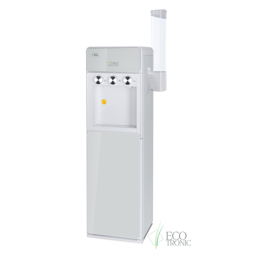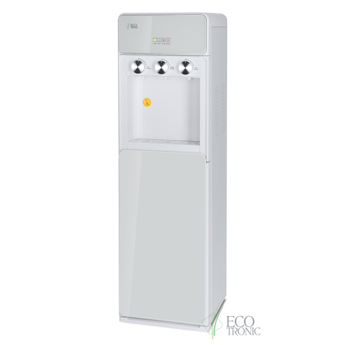 Напольный кулер с нижней загрузкой бутыли, поворотными кранами подачи воды и электронным охлаждением.