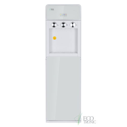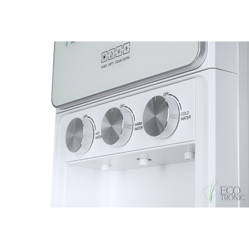 Стильные алюминиевые поворотные краны, корпус полностью белого цвета и нижний отсек, в котором полностью скрывается бутыль, позволяют эффектно вписать этот кулер в современный интерьер с продуманным дизайном.