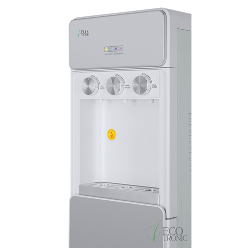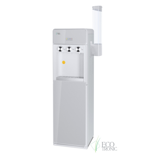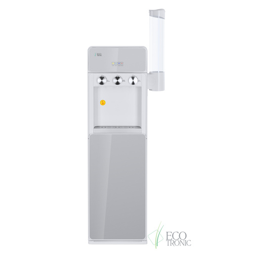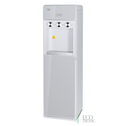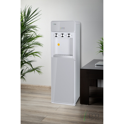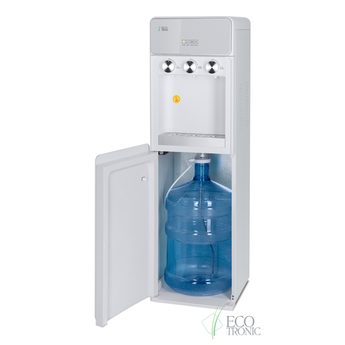 Напольный кулер с нижней загрузкой бутыли, поворотными кранами подачи воды и электронным охлаждением.