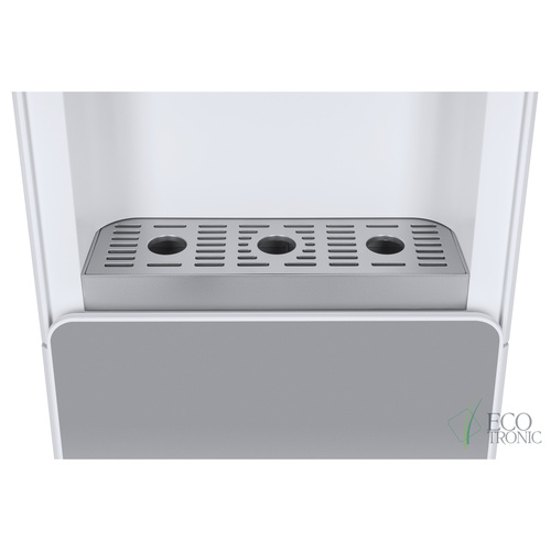 Стильные алюминиевые поворотные краны, корпус белого цвета с серебристыми вставками на передней панели, серебристый лоток водоприема и нижний отсек, в котором полностью скрывается бутыль, позволяют эффектно вписать этот кулер в современный интерьер с продуманным дизайном.