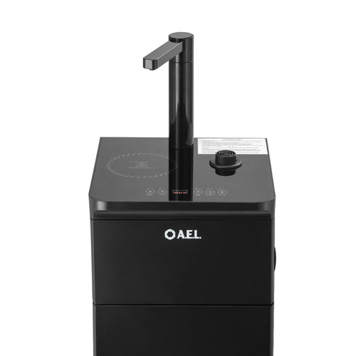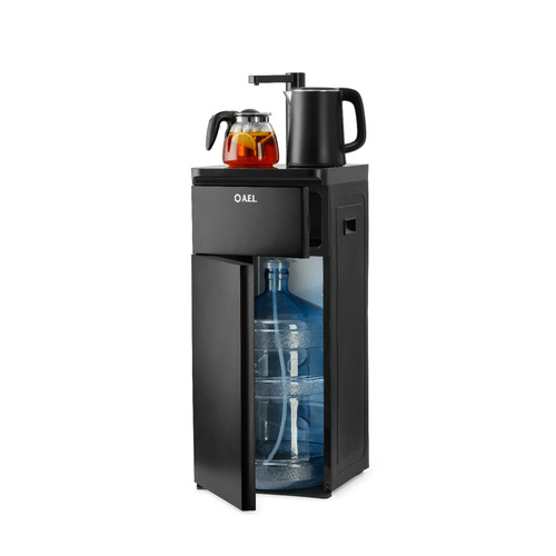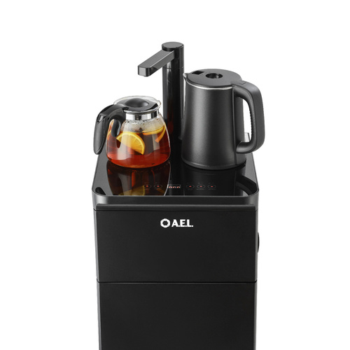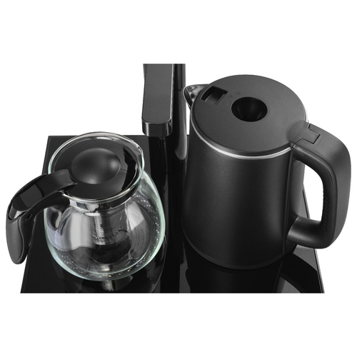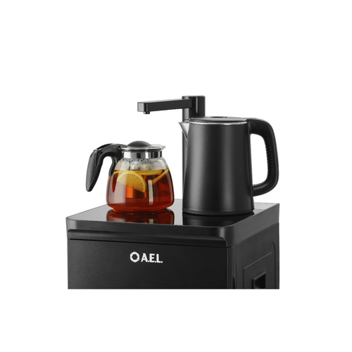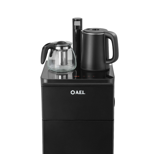 Оригинальное исполнение кулера с нижней загрузкой бутыли и без охлаждения, состоит из заварочного и электрического чайников, сенсорной панели управления и шкафчика для хранения.