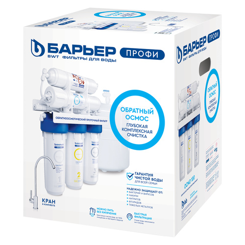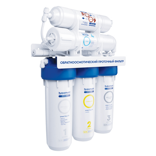 4. БАРЬЕР ПРОФИ Осмо 100. Обратноосмотическая мембрана производительностью в 100 галлон (≈ 288 литров в сутки) из тонкопленочного полиамидного композита. Очищает воду на молекулярном уровне от различных солей, хлоридов, фторидов, сульфатов, нитратов, ионов металлов, высокомолекулярных органических соединений и различных микроорганизмов. Все вредные примеси смываются в дренаж. Рекомендуемая частота замены — раз в 12-18 месяцев