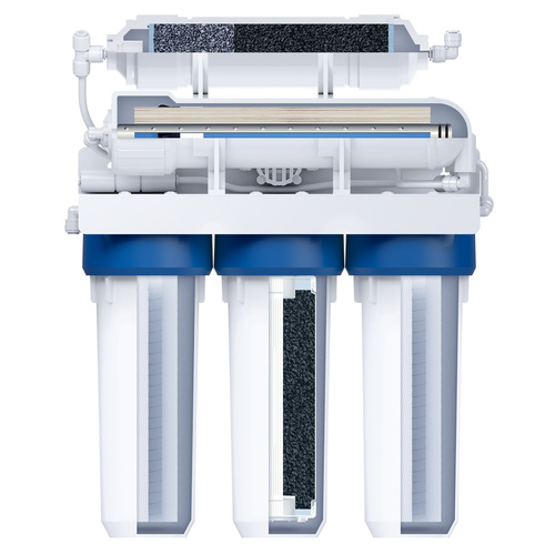 Пятиступенчатый фильтр обратного осмоса в классическом корпусе с картриджами стандарта Slim Line 10. Вода проходит 5 этапов очистки, включая обратноосмотическую мембрану. Тонкопленочный полиамидный композит, из которого изготовлена мембрана, очищает воду на молекулярном уровне до 100%, задерживая всевозможные примеси, включая бактерии и вирусы. Вода после фильтра обратного осмоса не уступает по качеству бутилированной. Показатели после фильтрации: общая минерализация — до 50 ppm, pH в диапазоне 6-9. Показатель минерализации может варьироваться в зависимости от условий эксплуатации и водопотребления.
