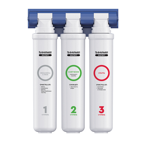 3 ступень — картридж "БАРЬЕР ЭКСПЕРТ Ультра". Мембрана с размером пор не более 0,03 мкм задерживает примеси и бактерии, но в отличие от обратноосмотической мембраны не обессоливает воду.