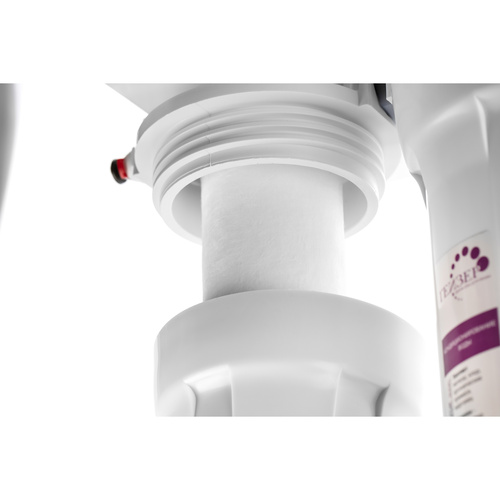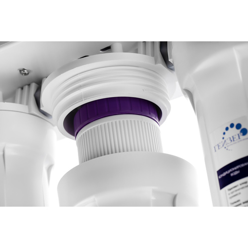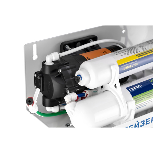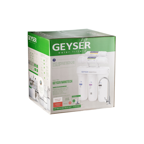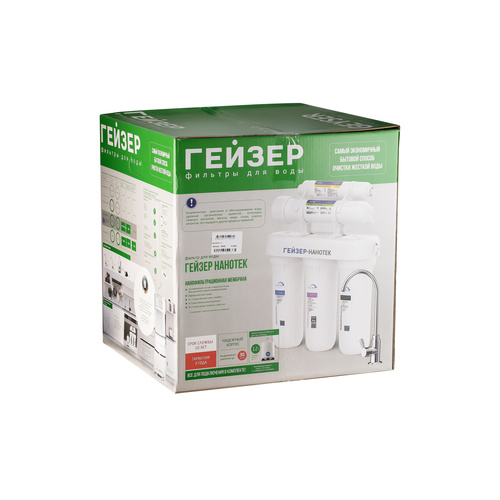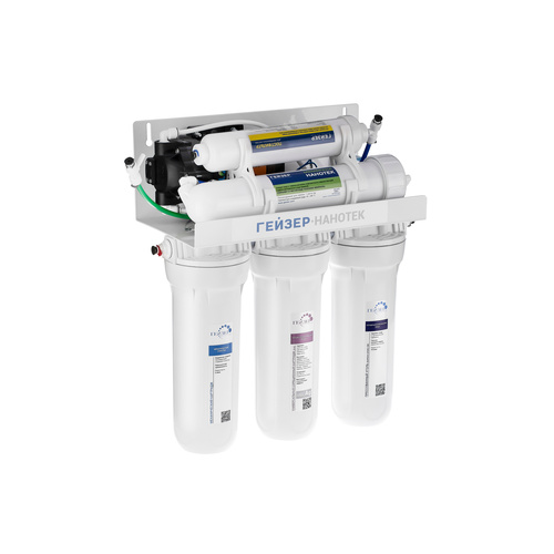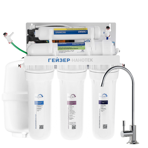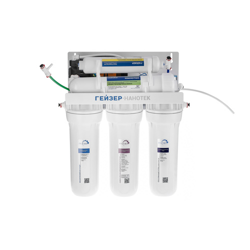 Гейзер Нанотек П — это мембранный фильтр, конструктивно схожий с системами обратного осмоса. Основным его отличием является мембрана. Размер её пор в 0,001 мкм находится посередине между порами обратноосмотических и ультрафильтрационных мембран. Это позволяет получить воду высокой степени очистки, но в то же время избежать её полного обессоливания. Гейзер Нанотек способен снизить содержание солей жесткости в воде на 80%, что обеспечит отсутствие накипи в чайниках, а также защитит утюги, кофемашины и другую бытовую технику. Фильтр Гейзер Нанотек П работает при давлении в подводящей магистрали от 0,5 атм. Устройство повышения давления, входящее в комплект, повысит уровень давления до 3-6 атм.