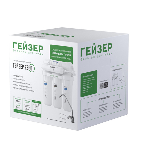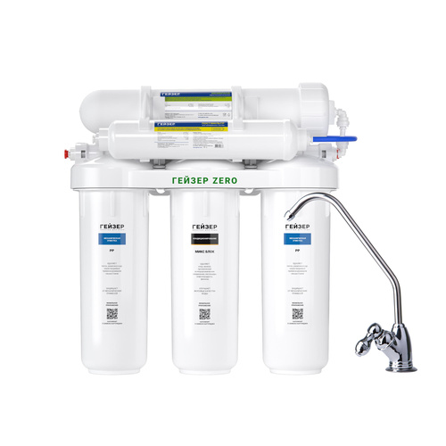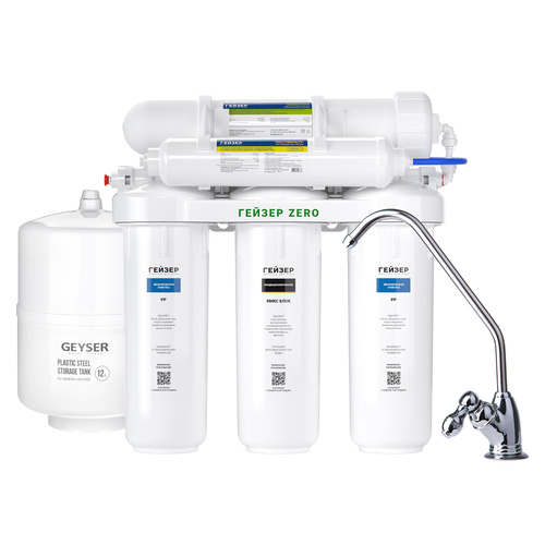 Система обратного осмоса Гейзер ZeRo 50 — мембранный фильтр с накопительным баком 12 л, с краном в комплекте поставки. Мембрана обратного осмоса – барьер на пути загрязнений всех видов: нерастворимых и растворимых примесей. Удаляя бактерии и вирусы, она также обеззараживает воду. Обратноосмотический фильтр с краном Гейзер ZeRo 50 включает мембрану производительностью 50GPD с порами размером 0,0001 мкм. Она задерживает соли жесткости и тяжелых металлов, радионуклиды, микропластик, бактерии и вирусы.