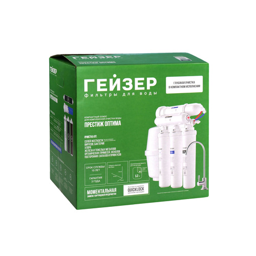 Обратноосмотический фильтр с накопительным баком Гейзер Престиж Оптима – современная компактная система доочистки водопроводной воды. Картриджи предварительной очистки быстросъемные, с креплением QUICKLOCK, что упрощает обслуживание системы: на их замену потребуется всего пара минут.