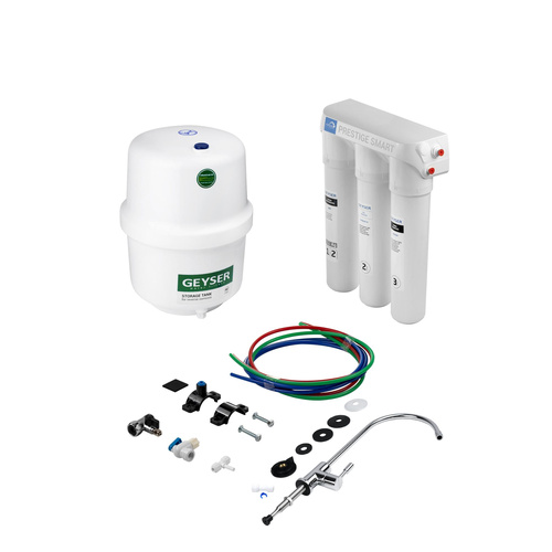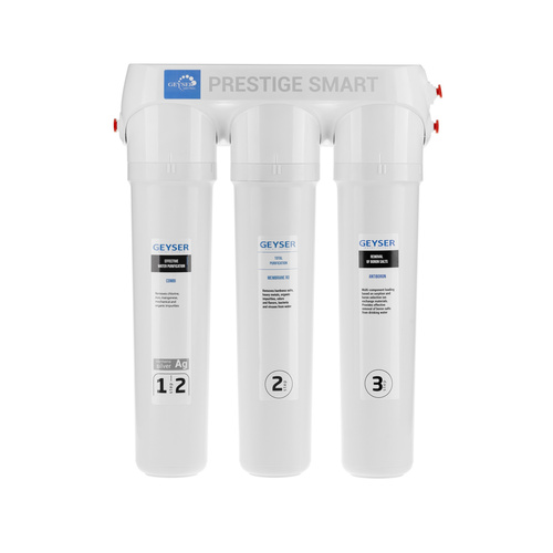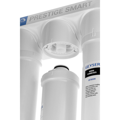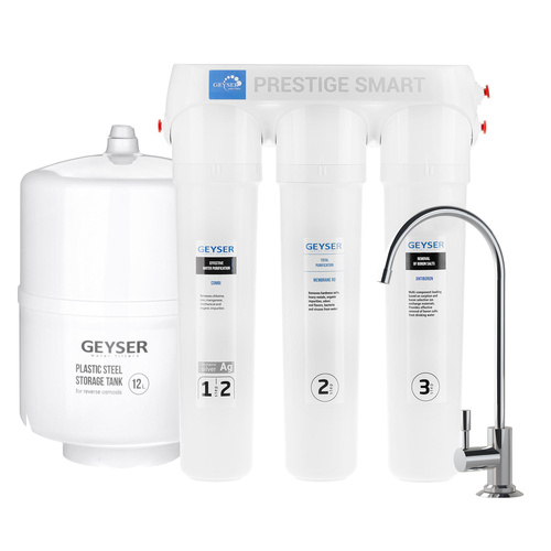 Технология обратного осмоса, использованная в фильтре Гейзер Престиж Смарт Антибор, заключается в фильтрации воды через полупроницаемую мембрану. Размеры пор мембраны настолько малы, что пропускают только молекулы воды. Размер молекул большинства примесей, а также бактерий и вирусов значительно больше молекул воды, поэтому они не проходят через мембрану. Система работает при давлении в подводящей магистрали не менее 3 атм.