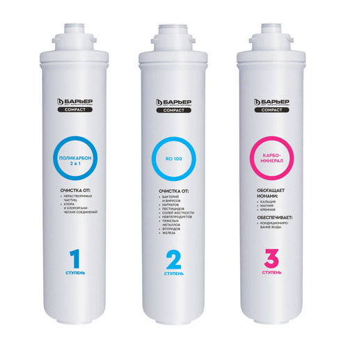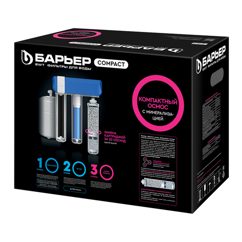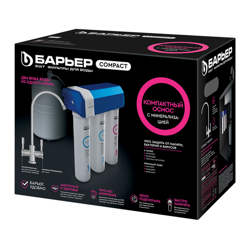 Больше не нужно выбирать: чистая или полезная? Получите от воды максимум! БАРЬЕР Компакт ОСМО 100 M – первая компактная трехступенчатая система обратного осмоса с двумя видами воды из одного крана. Она удаляет все возможные примеси и обогащает полезными минералами – магнием, кальцием, кремнием. В результате вы получаете воду чистую и безопасную воду для любых ситуаций: кристально чистую – для техники и приготовления еды, и полезную, обогащенную минералами – для питья.
