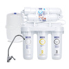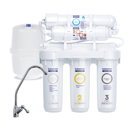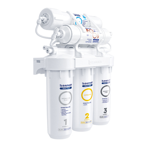Пятиступенчатый фильтр обратного осмоса в корпусе классического исполнения с картриджами стандарта Slim Line 10. Вода проходит 5 этапов очистки, включая обратноосмотическую мембрану. Тонкопленочный полиамидный композит, из которого изготовлена мембрана, очищает воду на молекулярном уровне до 100%, задерживая всевозможные примеси, включая бактерии и вирусы. Вода после фильтра обратного осмоса не уступает по качеству бутилированной. Показатели после фильтрации: общая минерализация — до 50 ppm, pH в диапазоне 6-9. Показатель минерализации может варьироваться в зависимости от условий эксплуатации и водопотребления.
