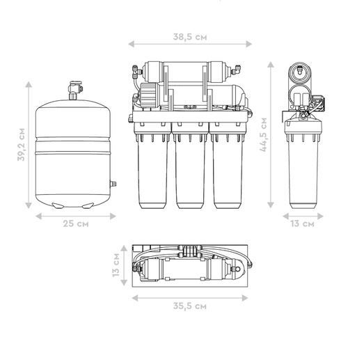 Очищает воду до 100%, удаляя все примеси, включая соли жесткости — причину накипи, бактерии и вирусы. Подходит для доочистки как после городского водопровода, так и после коттеджной системы. Производительность фильтра — не менее 1 л/мин, ресурс — 5 000 литров. Рабочее давление — от 2,5 до 7 атм. Без крана в комплекте.