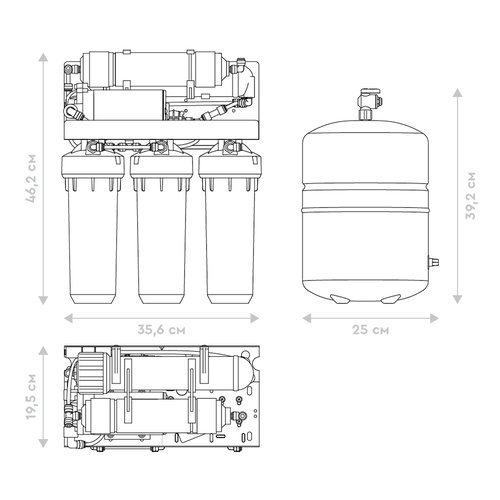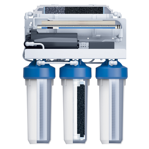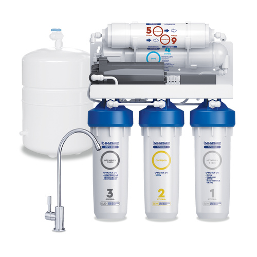 Пятиступенчатый фильтр обратного осмоса в корпусе классического исполнения с картриджами стандарта Slim Line 10. Вода проходит 5 этапов очистки, включая обратноосмотическую мембрану. Тонкопленочный полиамидный композит, из которого изготовлена мембрана, очищает воду на молекулярном уровне до 100%, задерживая всевозможные примеси, включая бактерии и вирусы. Вода после фильтра обратного осмоса не уступает по качеству бутилированной. Показатели после фильтрации: общая минерализация — до 50 ppm, pH в диапазоне 6-9. Показатель минерализации может варьироваться в зависимости от условий эксплуатации и водопотребления.