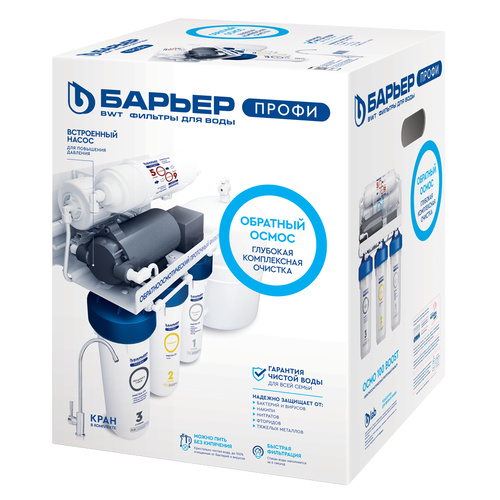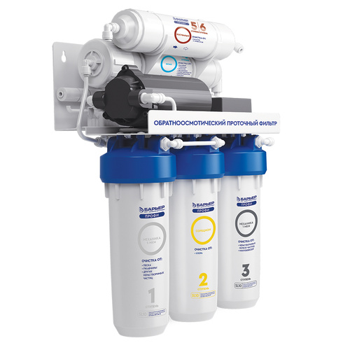 4. БАРЬЕР ПРОФИ Осмо 100. Обратноосмотическая мембрана производительностью в 100 галлон (≈ 500 литров в сутки) из тонкопленочного полиамидного композита. Очищает воду на молекулярном уровне от различных солей, хлоридов, фторидов, сульфатов, нитратов, ионов металлов, высокомолекулярных органических соединений и различных микроорганизмов. Все вредные примеси смываются в дренаж. Рекомендуемая частота замены — раз в 12-18 месяцев.