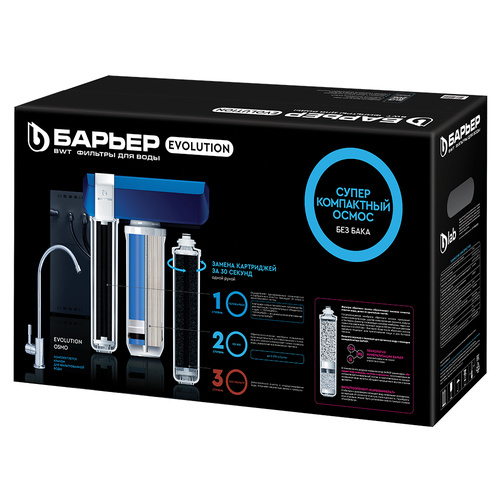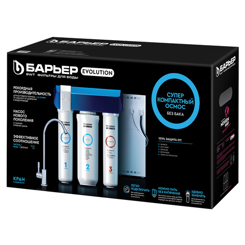 БАРЬЕР Эволюшн ОСМО это суперкомпактный осмос, в котором собраны наши лучшие разработки и технологии. Компактность — по размерам сопоставим с обычным проточным фильтром и помещается даже в самом ограниченном пространстве под мойкой как вертикально, так и горизонтально. Рекордная производительность — 600 галлон или около 2270 л/сутки — в 6 раз превосходит большинство бытовых осмосов. Выгода — эффективное соотношение чистой воды и дренажа – 2,5:1. При 2,5 литрах очищенной воды 1 литр уходит в дренаж, у классических систем обратного осмоса соотношение чистой воды к дренажу – 1:4. Удобство — продуманная конструкция фильтра позволяет менять картриджи без специальных инструментов, ключей и навыков всего за несколько секунд.