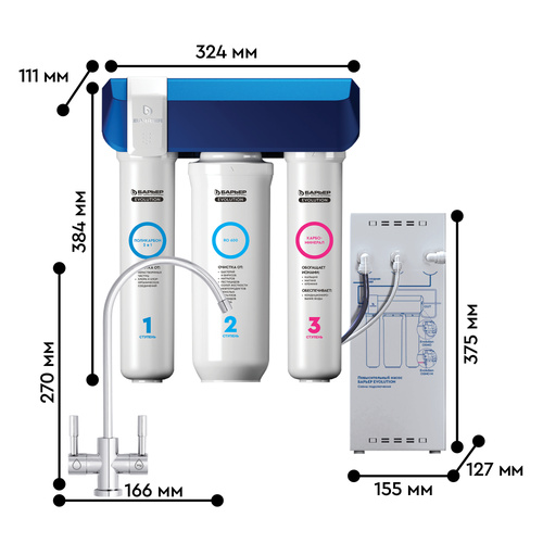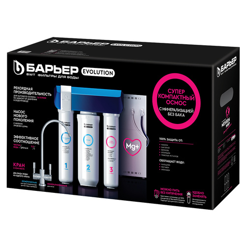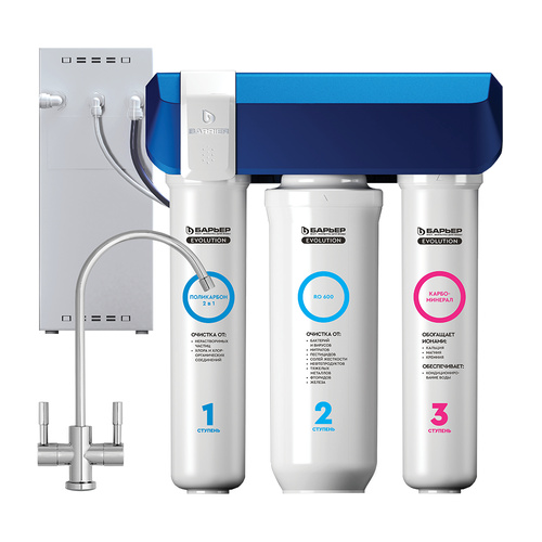 БАРЬЕР Эволюшн ОСМО M — это суперкомпактный осмос, в котором собраны наши лучшие разработки и технологии. В комплекте специальный кран, который позволяет использовать сразу 2 типа воды: обратноосмотическую — для бытовой техники и минерализованную — для питья. Компактность - по размерам сопоставим с обычным проточным фильтром и помещается даже в самом ограниченном пространстве под мойкой. Рекордная производительность — 600 галлон или около 2270 л/сутки — превосходит большинство бытовых осмосов. Выгода — эффективное соотношение чистой воды и дренажа – 2,5:1. При 2,5 литрах очищенной воды 1 литр уходит в дренаж, у классических систем обратного осмоса соотношение чистой воды к дренажу – 1:4. Удобство — продуманная конструкция фильтра позволяет менять картриджи без специальных инструментов, ключей и навыков всего за несколько секунд.